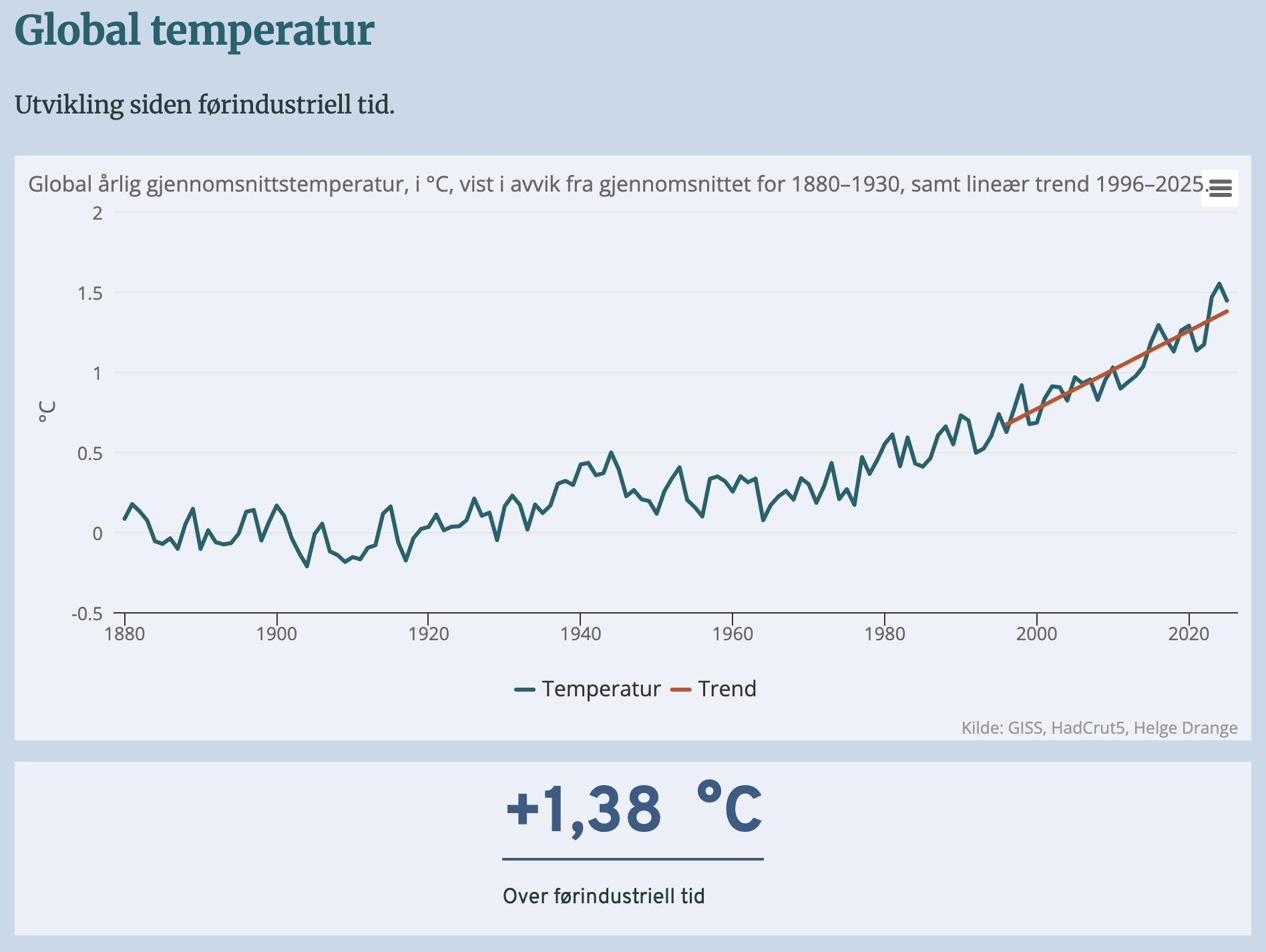 Frå Energi og Klima sin Klimavakten, Global Temperatur – data frå NASA Goddard Institute for Space Studies (GISS), HadCRUT5, Helge Drange